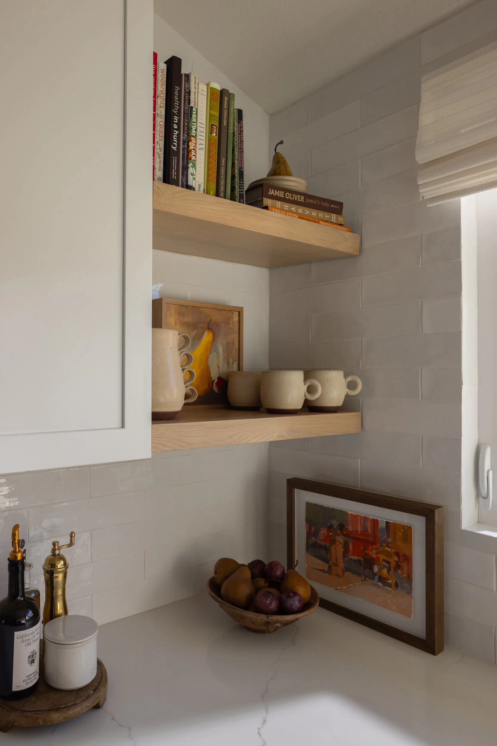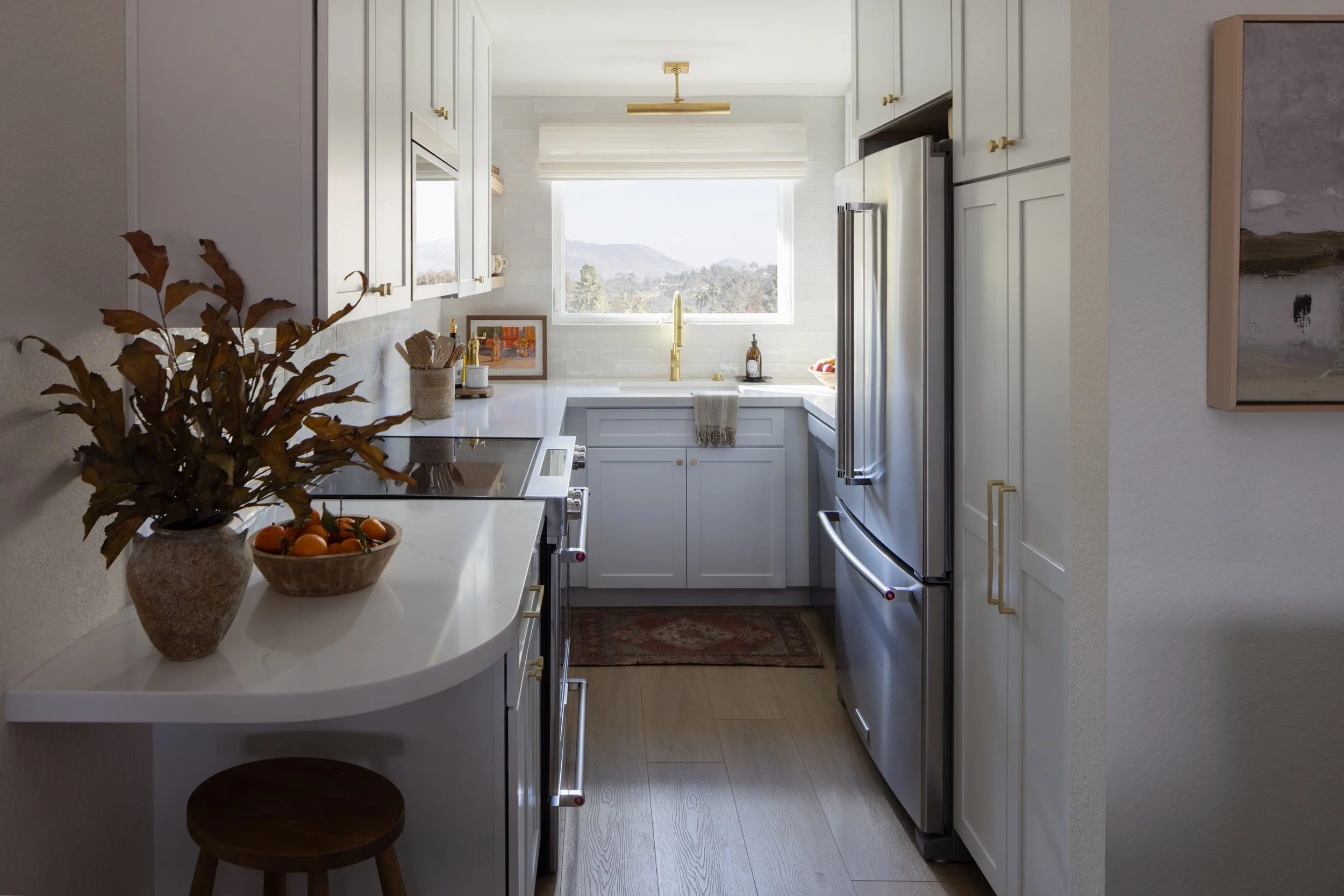 • For the kitchen, as it was a narrow area, I opened it up by sticking to a predominantly white palette for the shaker cabinets and Calcutta quartz countertops. I created a feminine texture for the walls with undulated white subway tiles that tie into the beautiful semi-circle counter for much needed curve appeal in the linear space. For finishings, I custom-made French linen window treatments and added bleached wovens for that clean and modern, yet softly rustic concept weaving in from the living room.