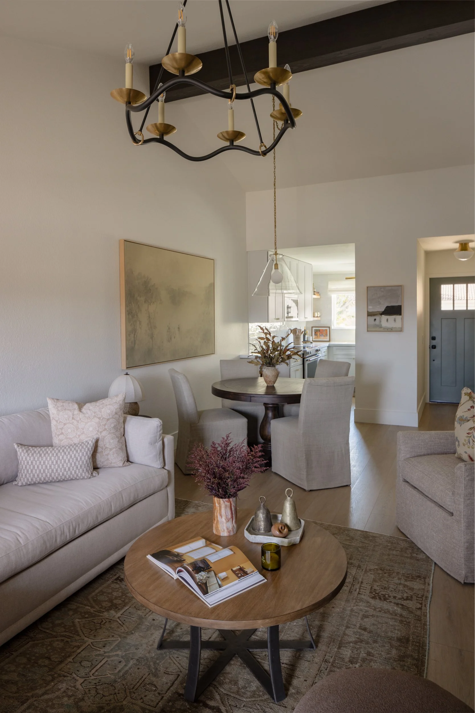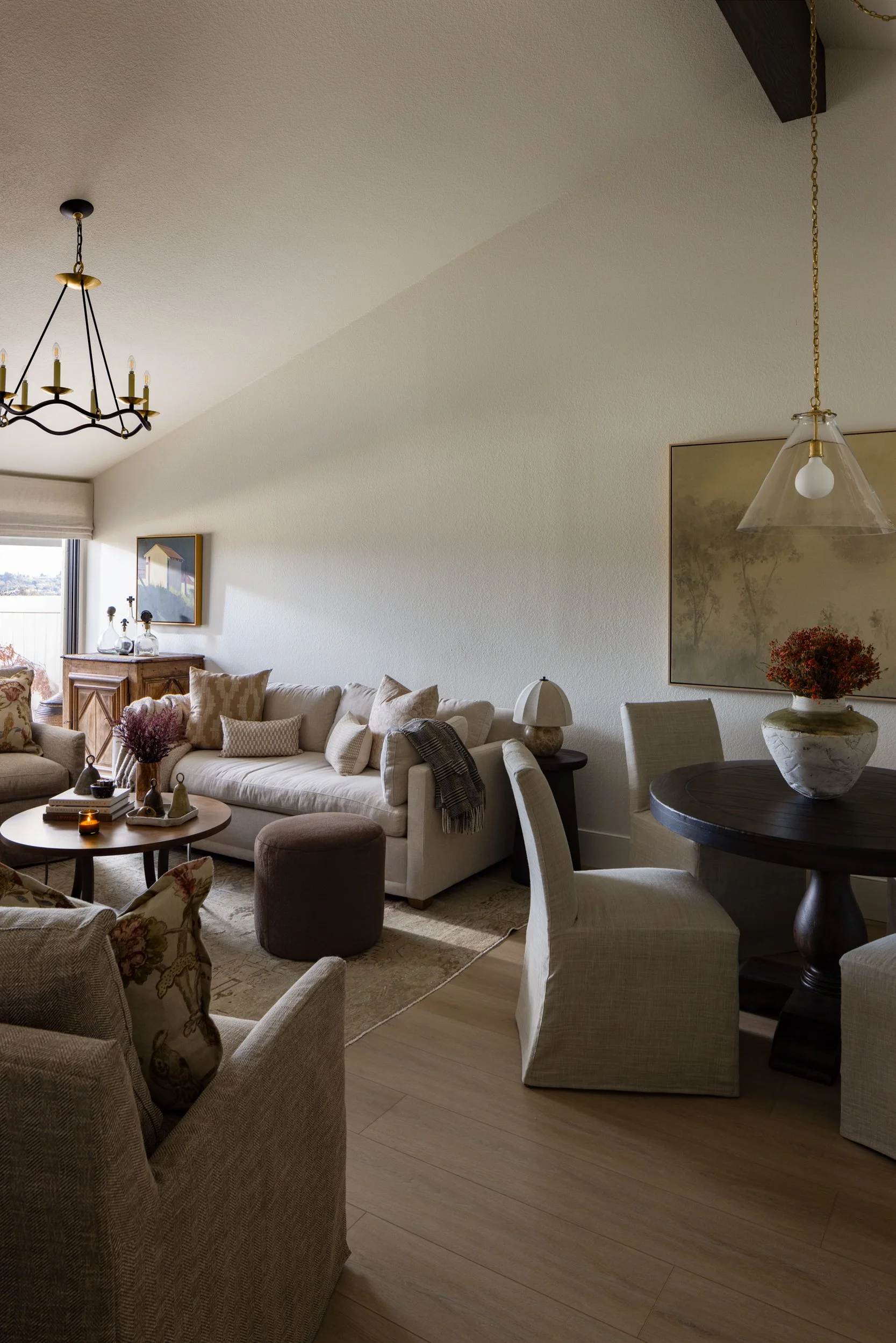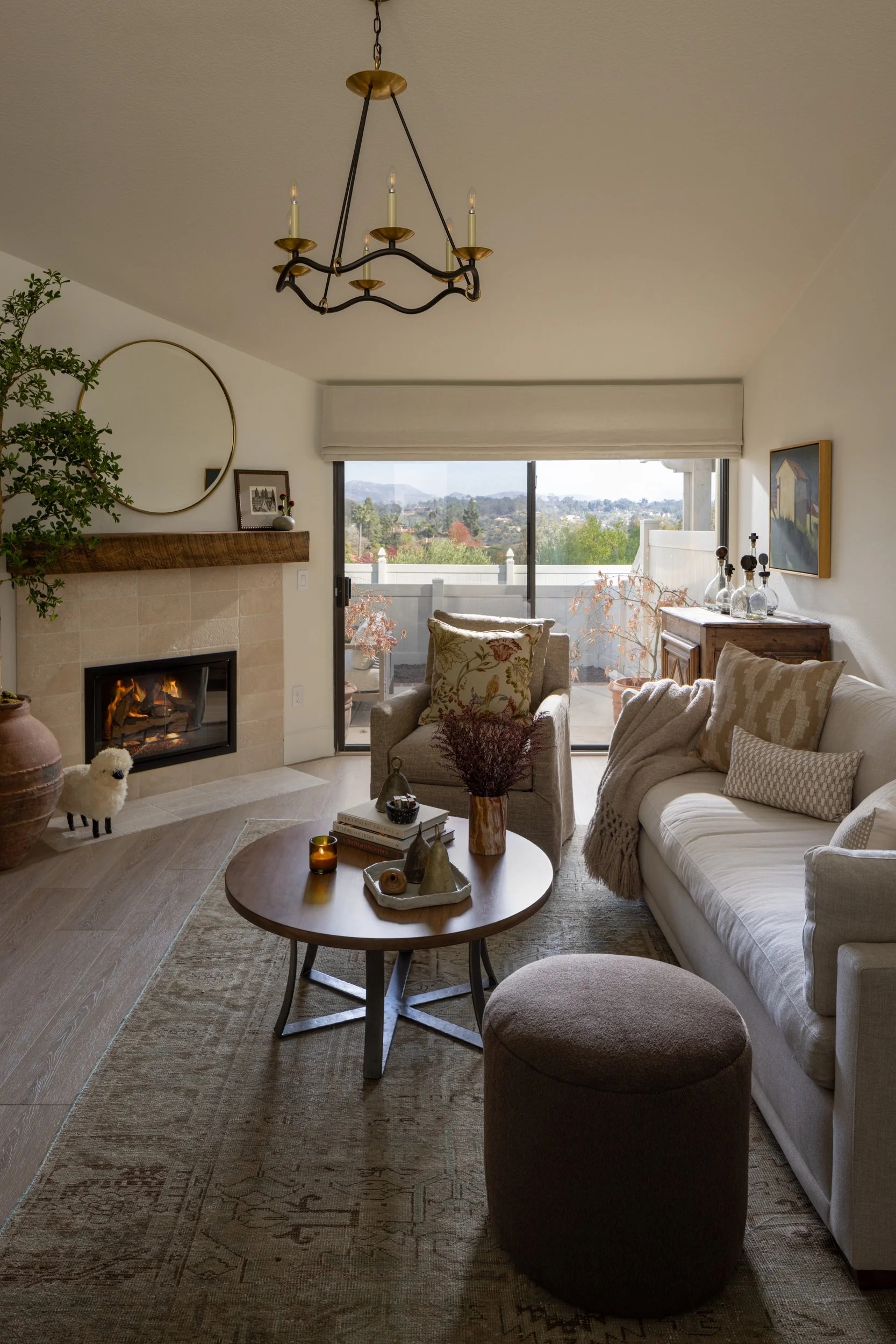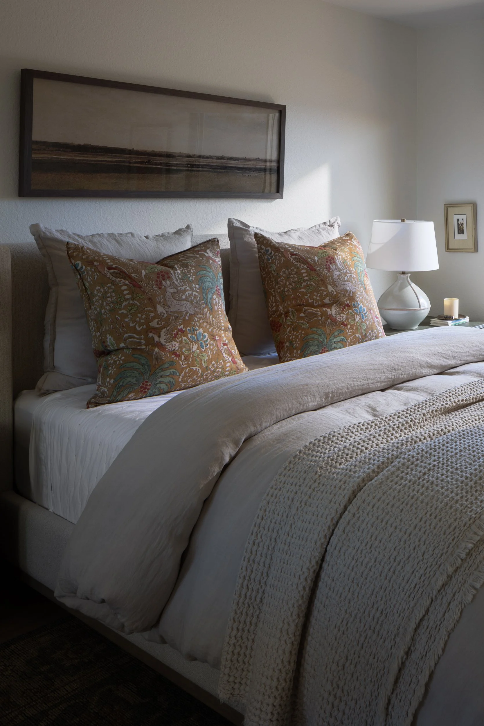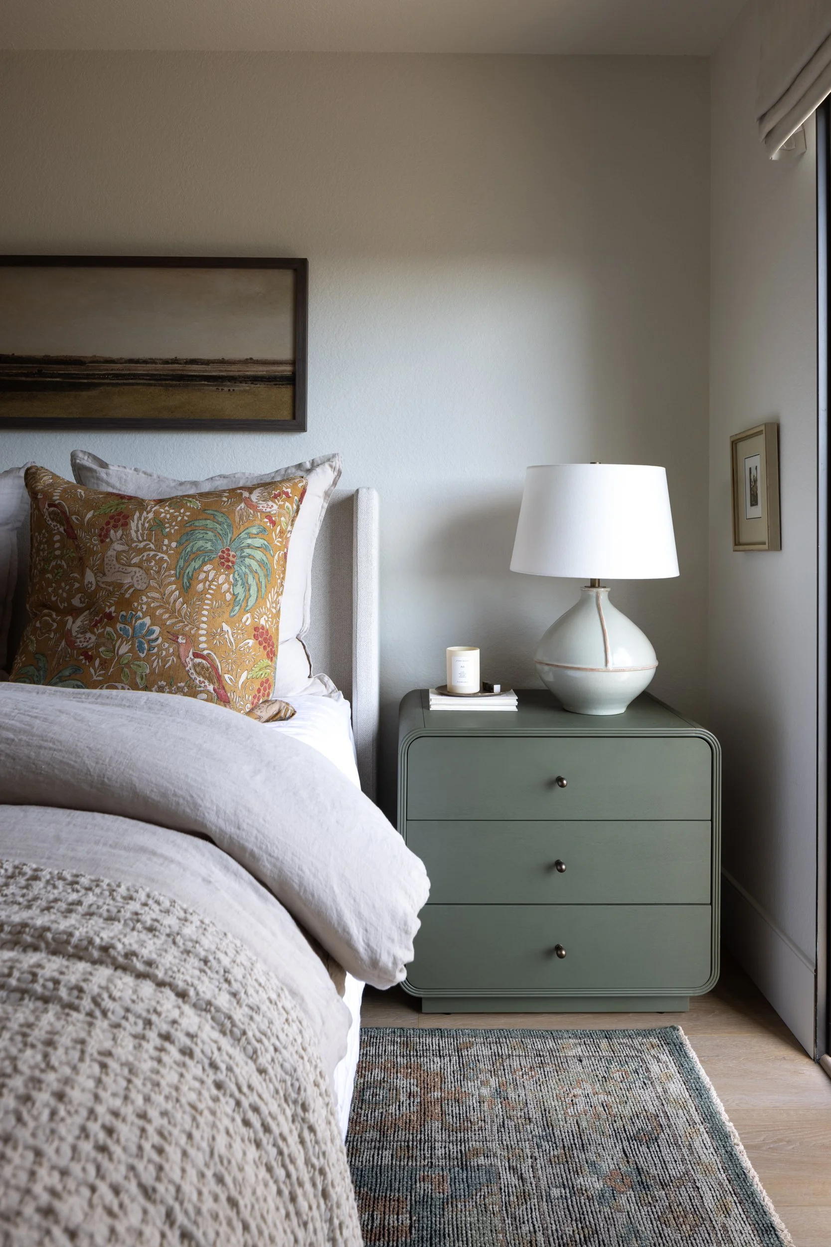 • A cozy retreat, the primary bedroom glorifies the fabric and texture theme I created for the living area. Plush yet down-to-earth, I mixed a Hail Mercantile neutral, natural linens with Mulberry pillows that bring in the muted, bucolic pastoral scene. The nightstands bookend the bed in a matching, soothing sage green sampled from the pillows. Lastly, a Loloi rug rounds out the room and anchors the space with a well-worn, familial appeal that ups the comfort factor for feeling truly at home and at peace.ription
