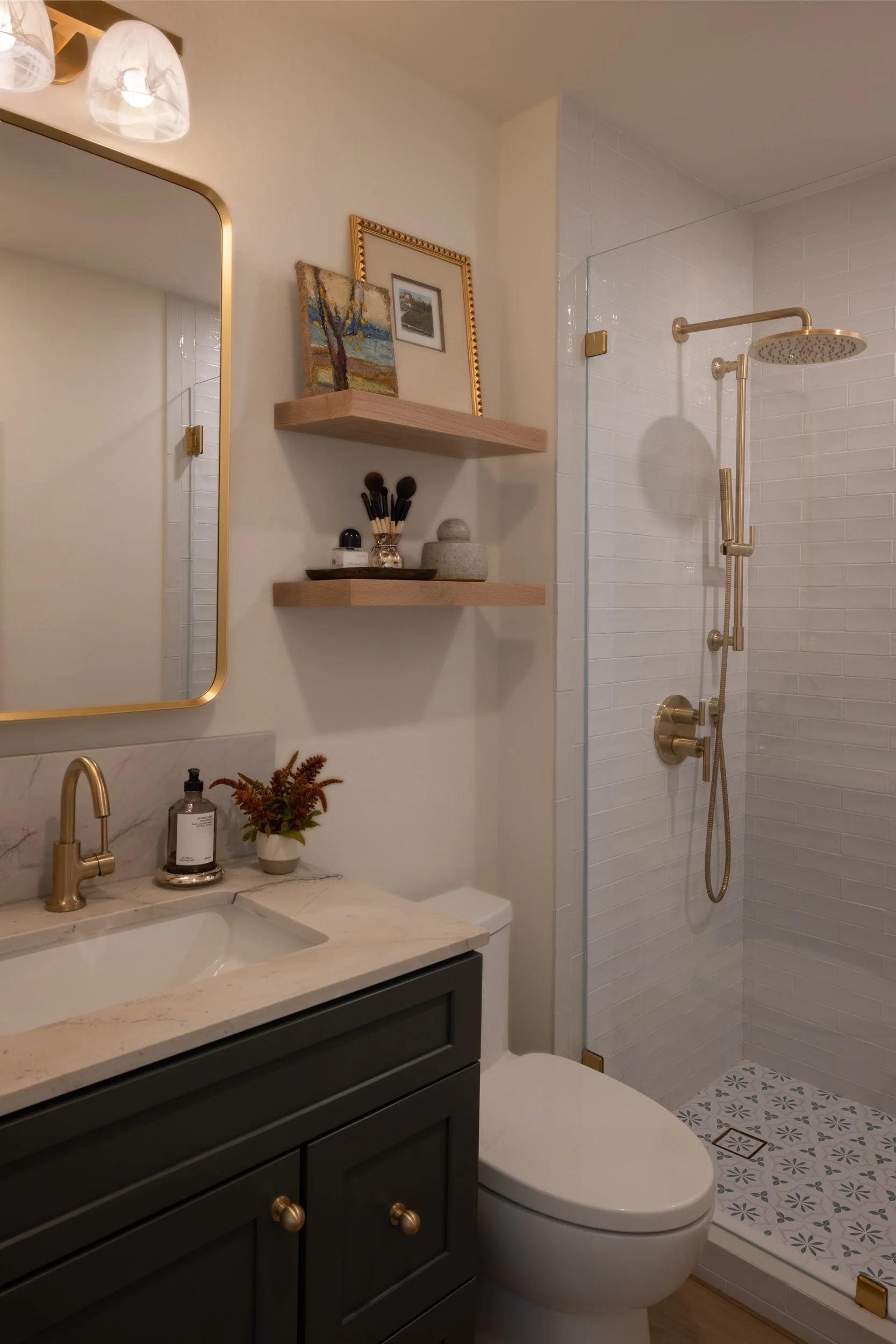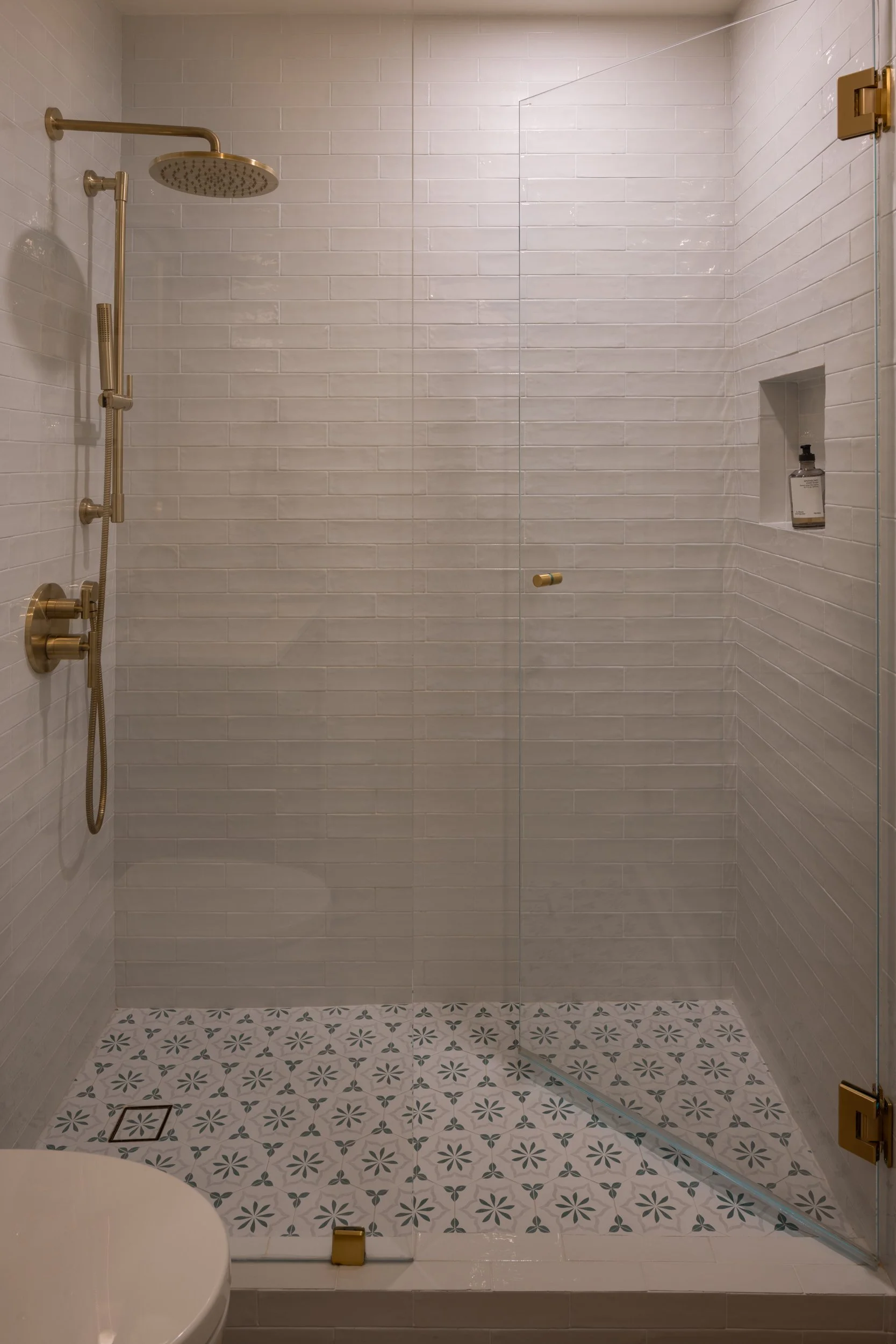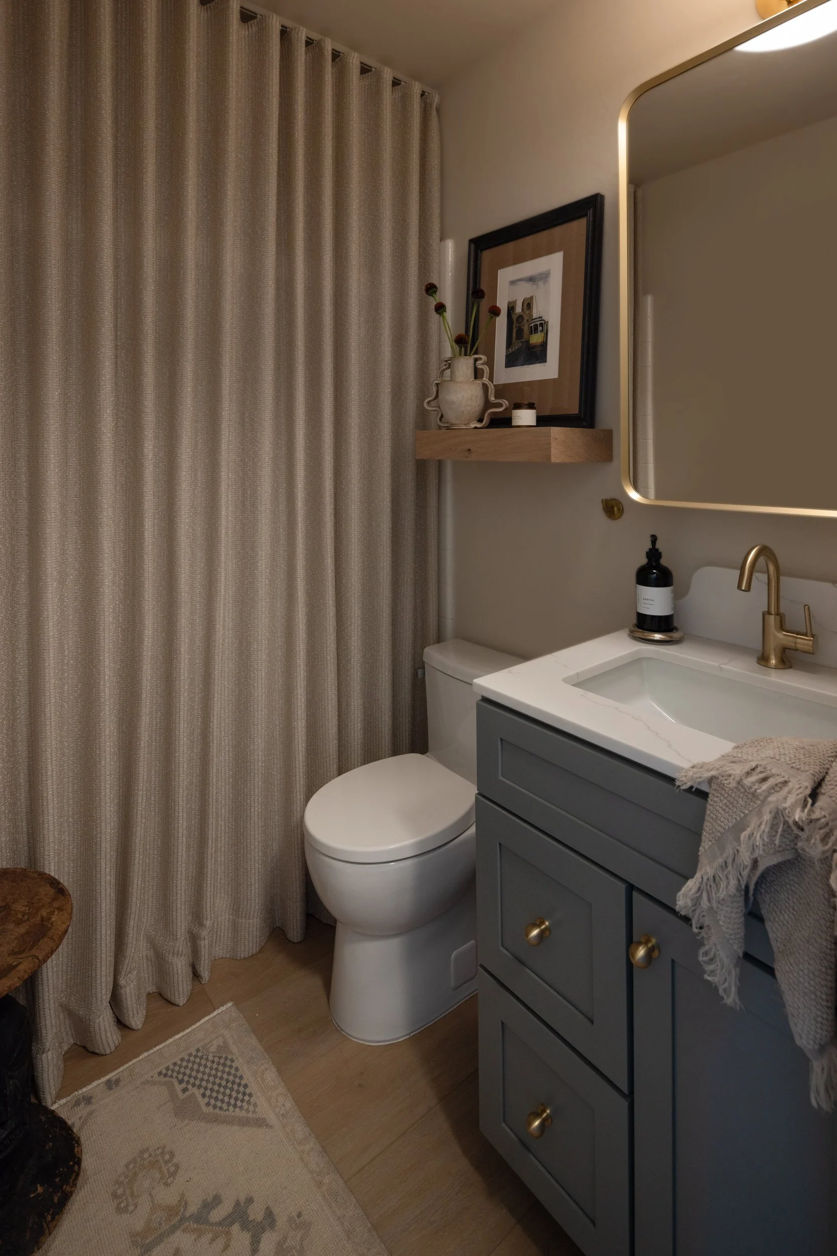 • The bathrooms follow the same creative intention as the kitchen for a strong, cohesive concept. Small but sensorial, the primary bathroom received the same undulated white subway tiles for feminine softness while the ceramic floral-patterned floor tiles on the shower pan underscore that idea. I then color matched the vanity to complete the look. For the guest bathroom, I chose a vintage rug and pulled out muted, neutral shades that I color matched to the vanity and walls. The muted neutrals complement the secondary color story of the townhouse while adding a contrast to the white theme of the other rooms. To soften everything up, the client and I created a custom ripple shower curtain that brings in a fine, femininity while retaining needed structure from Kravets performance fabric line.m description