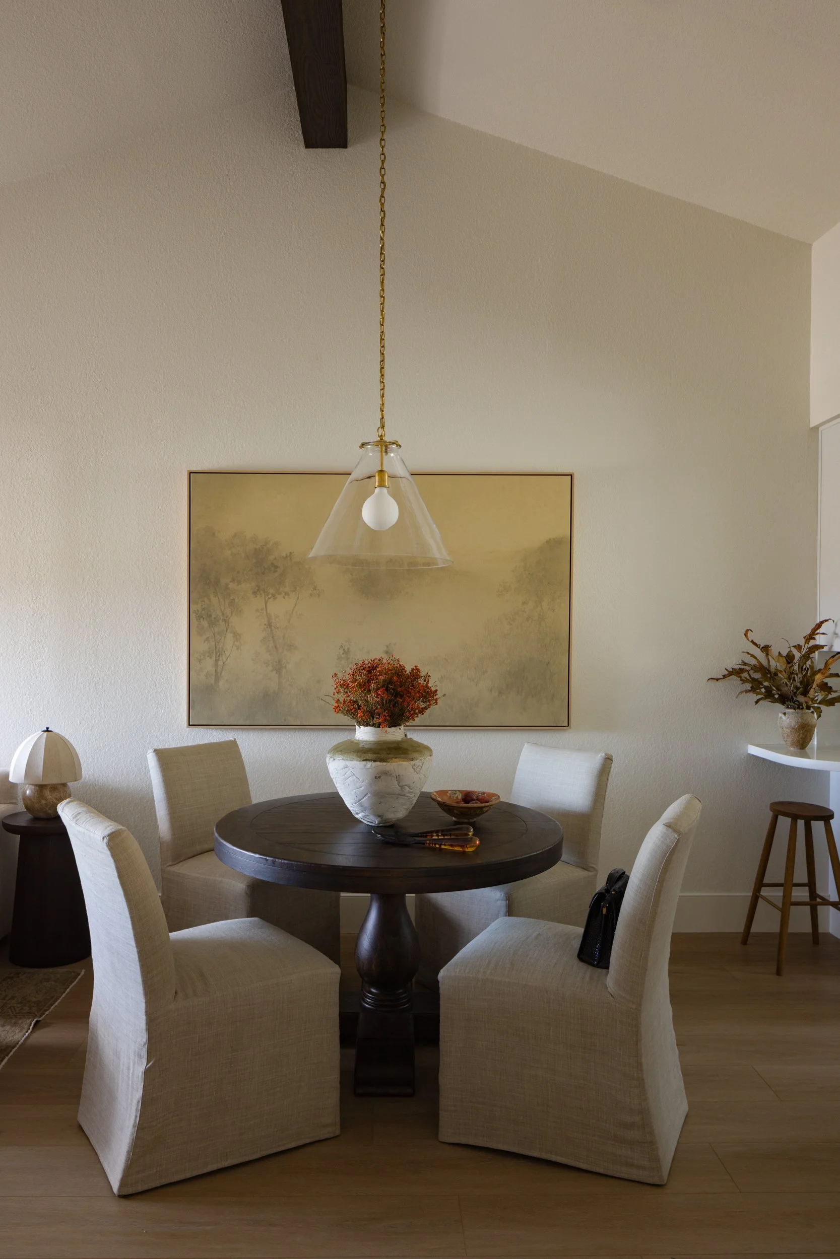 • White and welcoming with an elegant pastoral appeal, this client’s townhouse received a complete renovation to modernize the interior while creating a familial sensibility. We started by picking the color palette based off art pieces sourced from her family’s art gallery in North Carolina as well as a large-scale Aileen Fitzgerald watercolor painting for the dining area. The crux of the furnishings plays on the contrast of mixing new linen upholstery for a clean, comfortable ambiance with vintage pieces to bring in visually interesting forms. Whitewashed, wide-plank oak flooring throughout is the perfect setting to create the subtle contrast of soft materials paired with bolder shapes. The fireplace, as a focal point, received a neutral limestone subway tiling topped off with a custom-made reclaimed wood mantle for a lived-in, rustic look. An oversized Turkish pottery piece from local home decor shop, Apostrophe, additionally warms up the space. I updated all the light fixtures using Visual Comfort and Hudson Valley Lighting that play on the idea of chic, streamlined country living. Bringing in relaxed pops of bucolic color, dried florals, vintage vases, and custom Mulberry pillows layer in muted shades to add dimension to the room.